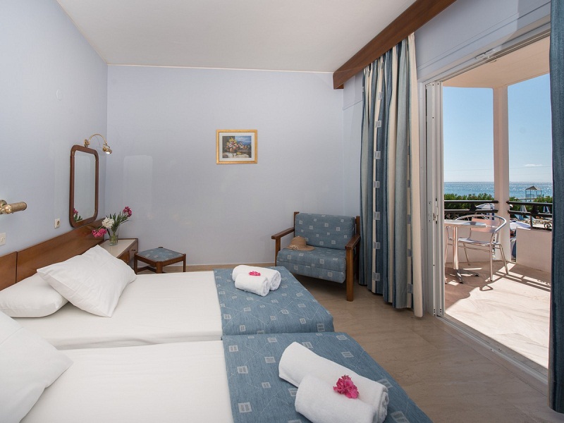 Hotelul dispune de camere duble sau triple cu un pat sau cu doua, care sunt dotate cu aer conditionat (gratuit doar in iulie si august), baie, uscator de par, radio si TV, telefon, seif (3 euro/zi), frigider (2 euro/zi), balcon.