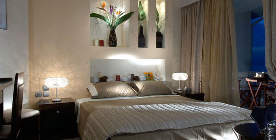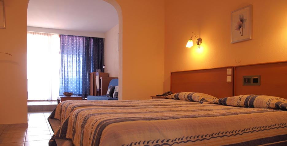 Toate cele 80 de camere au baie cu dus, balcon, aer conditionat, TV prin satelit, canale de muzica, frigider. Camerele duble au 20-25 mp si capacitatea de pana la 4 persoane. Camerele duble Superior, au vedere spre mare, o suprafata de 25-40 mp si capacitatea de 2-3 persoane sau 2 adulti si maxim 2 copii. Camerele Family au 18-25 mp, un pat dublu si doua paturi supraetajate. Camerele tip Junior Suite au o zona de living, suprafata de 30-40 mp si capacitatea maxima de 2 adulti si un infant. Camerele tip Suite duble sunt compuse din 2 incaperi, au suprafata de 50 mp si capacitatea de pana la 6 persoane. Suitele Deluxe cu vedere la mare au 80 mp, o capacitate maxima de 6 adulti, 1 copil si 1 infant si urmatoarele dotari: baie cu aer conditionat si cada cu hidromasaj, jacuzzi pe balcon, telefon, aparat pentru cafea espresso, uscator de par, acces la internet de mare viteza, living, mini bar, muzica, seif, TV satelit, papuci, Smart TV, sistem stereo cu CD, fierbator de apa, acces la internet WIFI (gratuit).