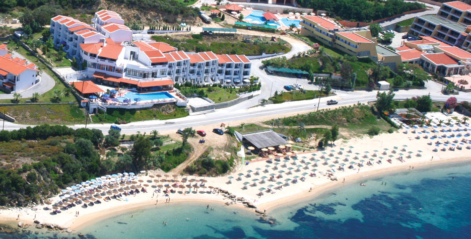 Hotelul este situat pe o panta verde din zona Tripiti, pe al treilea brat al peninsulei Halkidiki, Athos. Oraselul Ouranoupolis se afla la 5 minute de mers cu masina. Pe plaja cu nisip a hotelului, sezlongurile si umbrelele sunt gratuite daca se consuma ceva de la barul de pe plaja
