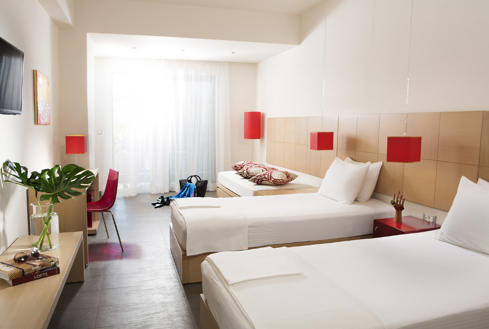 Camerele, spatioase, cu design minimalist, ofera eleganta si lux. Toate camerele au pat twin sau pat dublu si o zona de relaxare. Atentia la detalii este vizibila in fiecare camera, iar cosmeticele oferite sunt bazate pe ulei de masline. Toate camerele ofera un balcon cu vedere la mare sau vedere la munte. Camerele au in dotare: sistem de climatizare, TV prin satelit, conexiune internet Wi-Fi gratuit, minibar, uscator de par, seif, telefon, balcon.