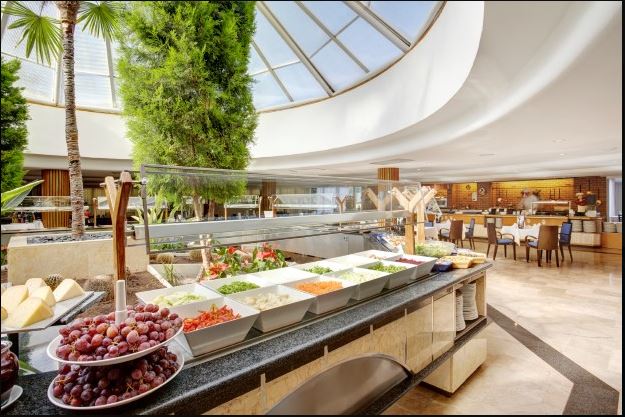 Hotelul ofera mic dejun (07:45-10:30) si cina (18:30-21:00) in restaurantul bufet. La barul hotelului se pot servi gustari usoare si o selectie de bauturi alcoolice si non alcoolice (11:00-24:00).