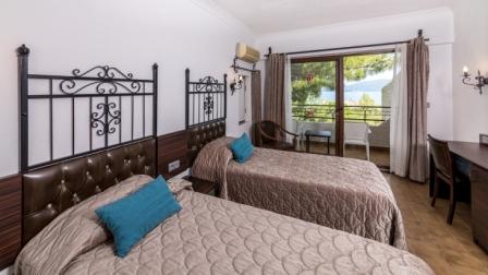 Camerele au suprafata de 15 mp, doua paturi twin sau pat dublu, LCD tv, telefon, minibar, aer conditionat, seif, baie cu wc, uscator de par. Camerele au vedere la piscina, mare si uscat.