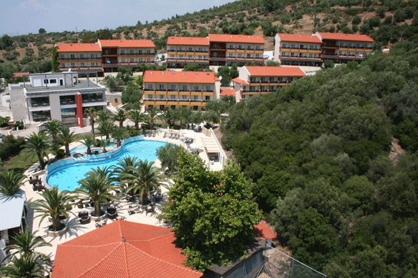Hotelul se afla pe bratul Sithonia al peninsulei Halkidiki, la 250 m de plaja cu nisip si este conectat de aceasta printr-o pasarela pietonala. Oraselul Cosmopolit Neos Marmaras este la 6 km, iar orasul Salonic la cca 110 km. Pe plaja cu nisip sezlongurile si umbrelele sunt contra cost (contra cost).