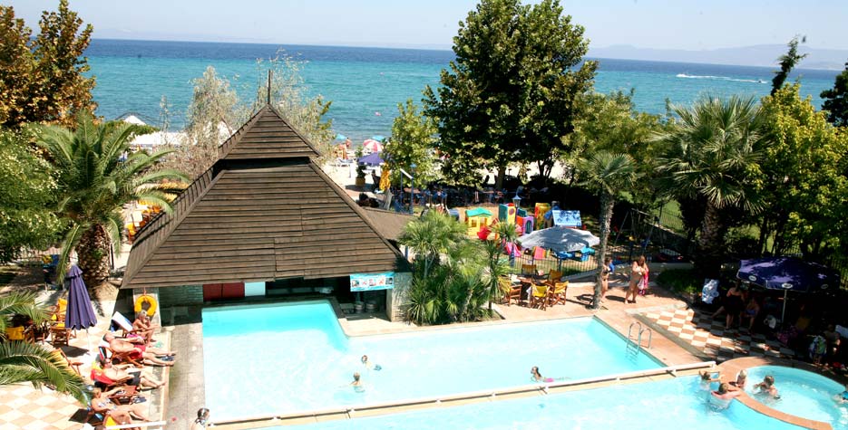 Hotelul se afla pe malul marii, la 200 m de centrul statiunii Hanioti, pe bratul Kassandra al peninsulei Halkidiki. Sezlongurile si umbrelele pe plaja sunt contra cost (cca 6-7 euro/2 sezlonguri si 1 umbrela). Este permis accesul animalelor de companie la solicitare, fara costuri suplimentare.
