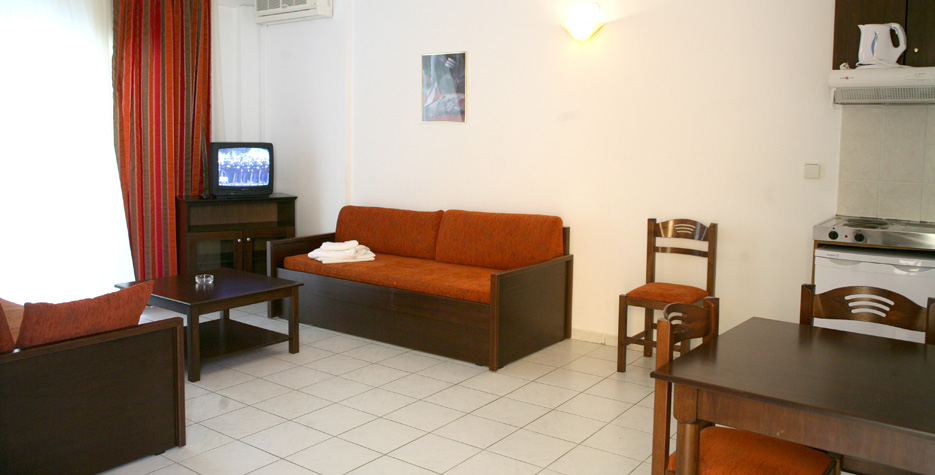 Camerele sunt confortabile si spatioase, decorate modern si practic si au: aer conditionat, seif, balcon sau terasa, baie cu cada sau dus, uscator de par, frigider, cuptor, bucatarie complet echipata, TV, acces gratuit la internet WIFI. Studiourile au o suprafata de cca 20-25 mp, unele au baie cu cada, altele cu dus si majoritatea sunt in cladirea noua. Capacitatea maxima a studiourilor este de 3 adulti sau 2 adulti si 2 copii. Apartamentele au cca 30-35 mp si sunt impartite in doua zone: o zona de bucatarie si living cu 2 canapele, separata printr-o usa de zona dormitorului cu pat matrimonial sau 2 paturi. Unitatea de aer conditionat este in zona living-ului. Capacitatea maxima a apartamentelor este de 2 adulti si 3 copii, 3 adulti si 2 copii sau 4 adulti si 1 copil.