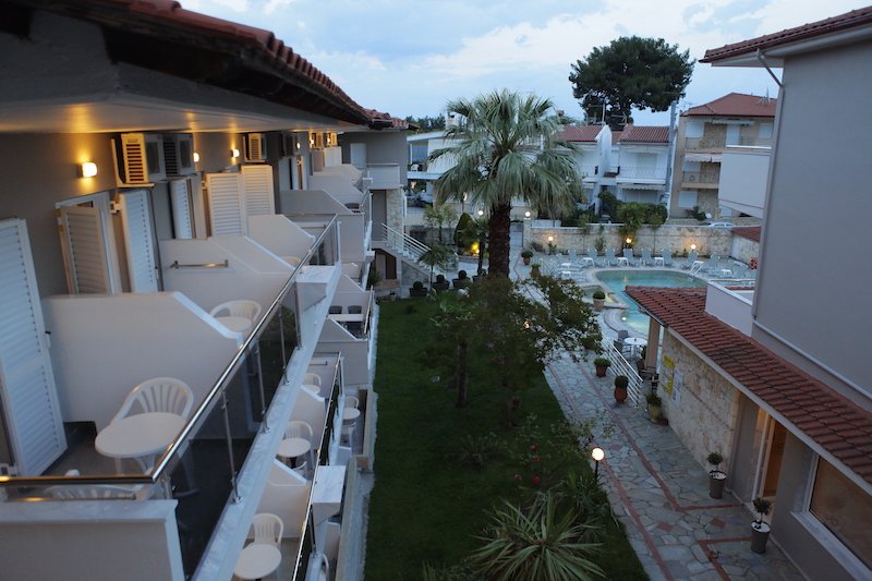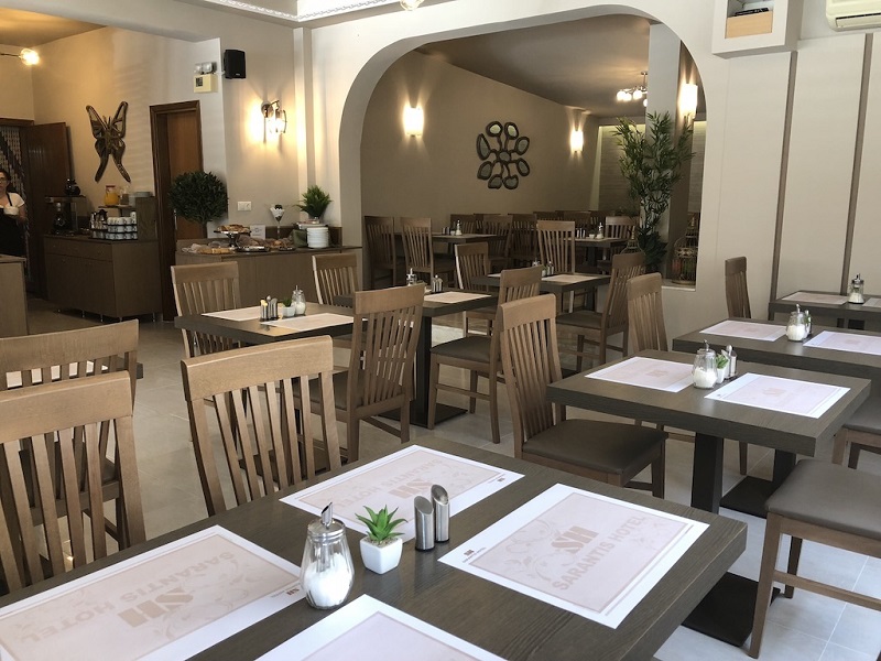 Hotelul Sarantis se intinde pe două mii de metri pătrați de teren, cu avantajul suplimentar de a fi la doar 300 m de plajă și 150 m de centrul orașului Hanioti, care este un sat tradițional și destul de faimos al peninsulei kassandra din Halkidki, de fapt Hanioti este mai degrabă stațiune cosmopolită care a devenit alegerea preferată pentru mii de turiști care își pot petrece vacanța în fiecare zi.