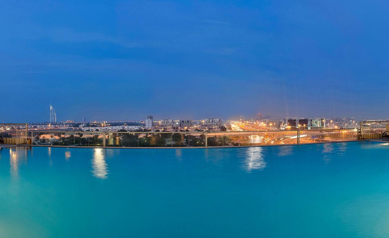 Hotel RENOVAT 2021 - DRY (nu serveste alcool) -ce ofera suite cu minimum living si dormitor, situat convenabil in zona Media City, pe Sheikh Zayed Road, langa statia de metrou Dubai Internet City, la 10 minute de Dubai Marina si plaja Jumeirah, vis a vis de Emirates Mall. Aeroportul International din Dubai se afla la aprox 25 km. Hotelul ofera WiFi gratuit! Piscina infinity ofera vedere spre Burj Al Arab. *Pentru PACHETE - Cina Revelion - Este inclusa! (Fara bauturi alcoolice)
