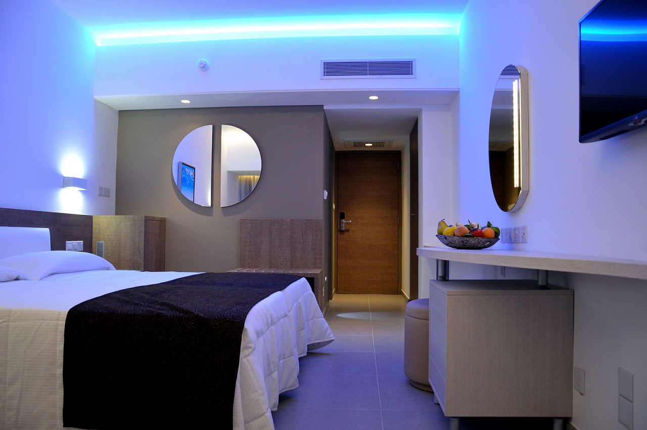 Camerele sunt dotate cu aer conditionat, mini bar, acces la internet WIFI (contra cost), seif, TV, balcon mobilat, baie cu cada sau dus, uscator de par. Camerele duble au 40 mp si capacitate maxima de 2 persoane. Camerele Suite cu vedere la mare sunt formate din 2 incaperi si au capacitate maxima de 2 adulti si 2 copii.